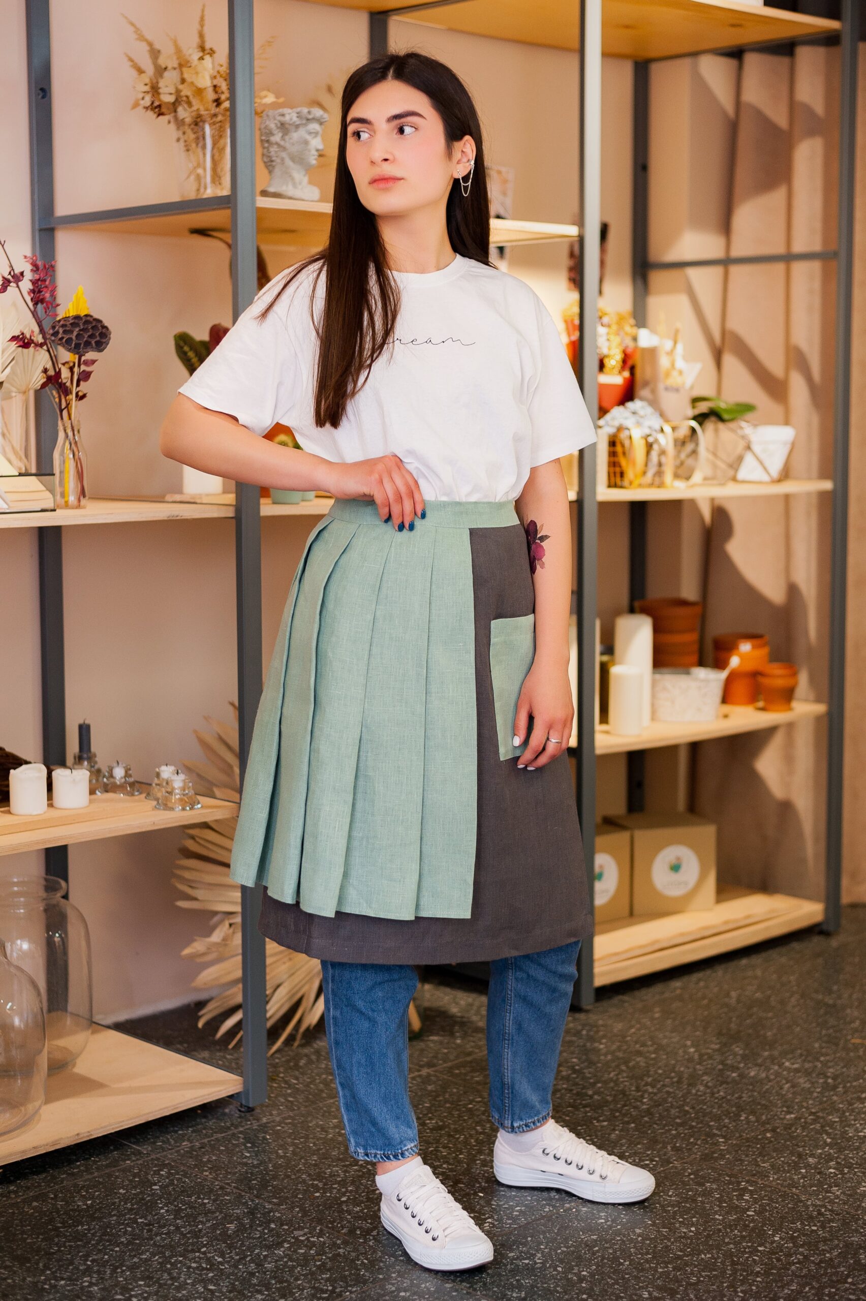 Фартух-плахта з карманом та деталлю у вигляді складок. Зав’язується з одного боку та нагадує по конструкції спідницю, проте насправді є дуже комфортним і стильним напівфартухом . Стане чудовим акцентом не тільки у квітковому магазині, а й в інших закладах!