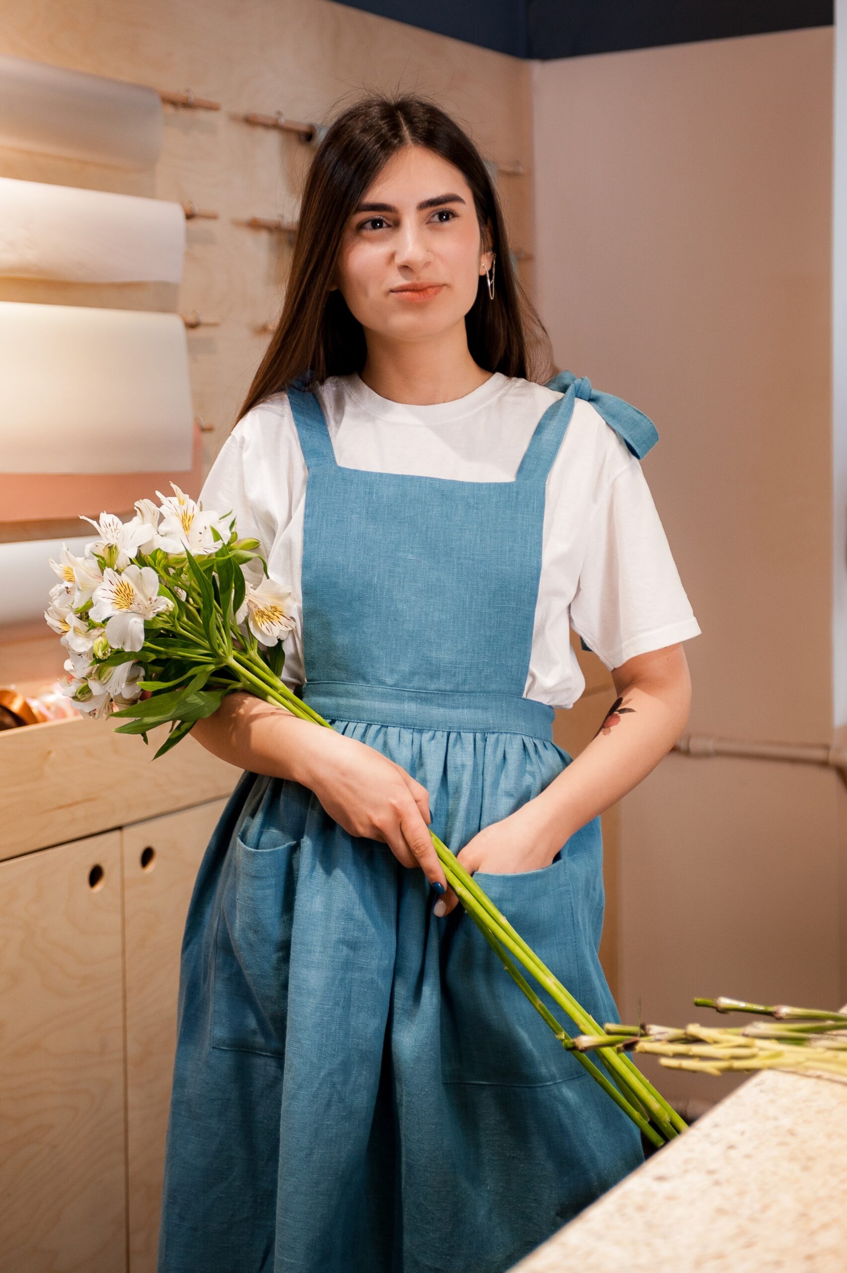 Синій фартух-сукні із зав’язками у вигляді бантів та двома карманами. Дуже зручний у використанні, а також неймовірно стильний на вигляд! Стане чудовим акцентом не тільки у квітковому магазині, а й в інших закладах!